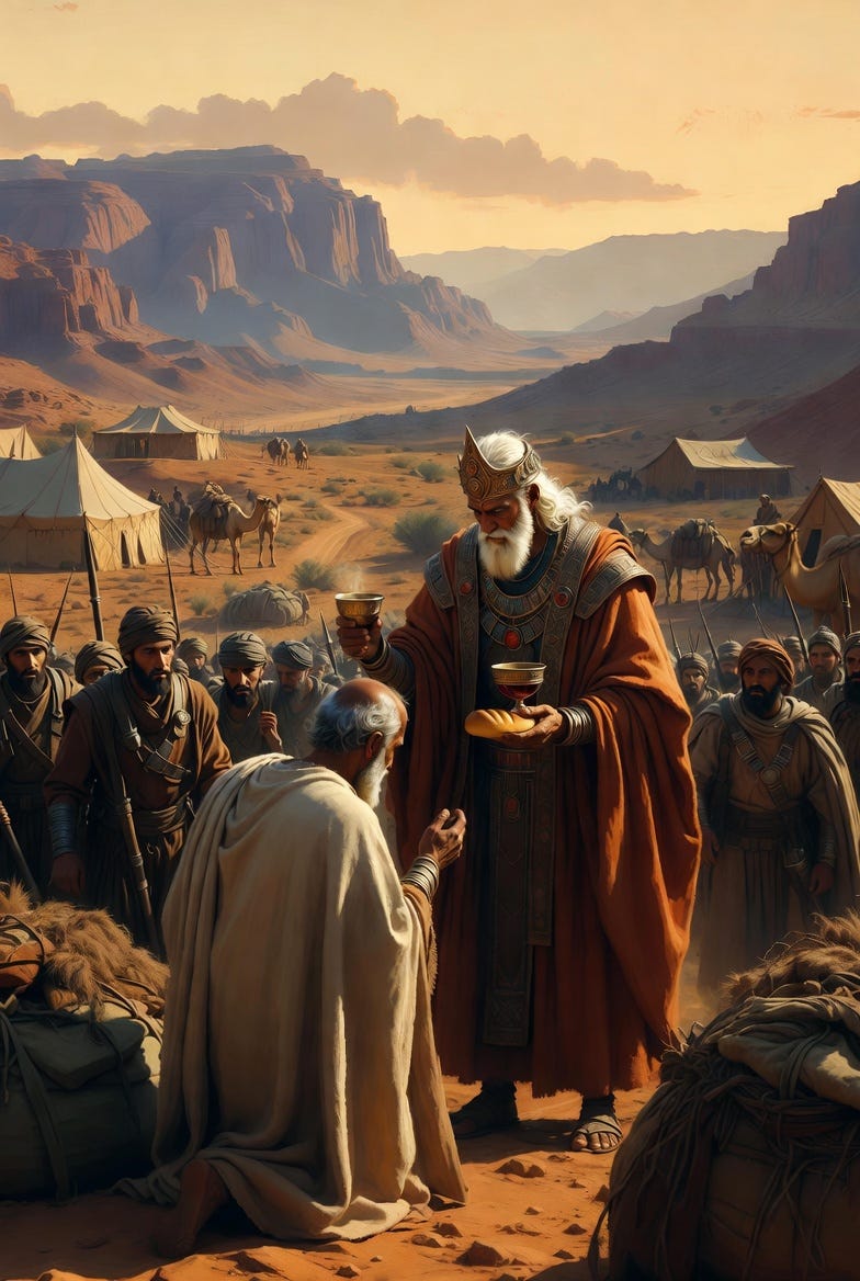 Upon Abram’s return, Melchizedek, the King of Salem, who was a priest of God Most High, came out with bread and wine. Melchizedek blessed Abram and God for delivering Chedorlaomer into his hands. Abram gave a tenth of the spoils of war to Melchizedek in response. The tenth Abram gave to Melchizedek had nothing to do with the tithe of the Mosaic Law. Abram gave this willingly, from the spoils of war. By offering Melchizedek a tenth, Abram showed that Melchizedek was greater than himself (Hebrews 7:1–4).