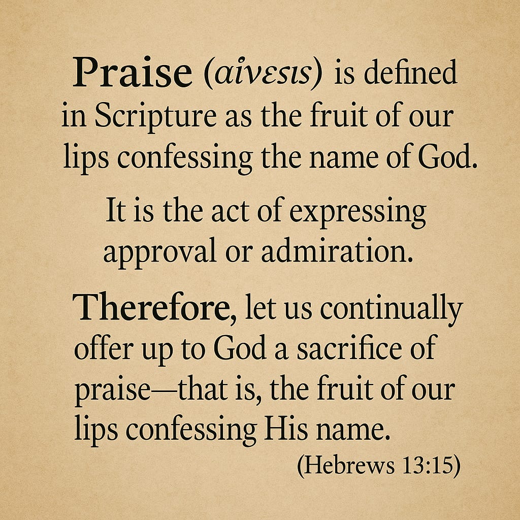 Praise (αἴνεσις) is defined in Scripture as the fruit of our lips confessing the name of God. It is the act of expressing approval or admiration.